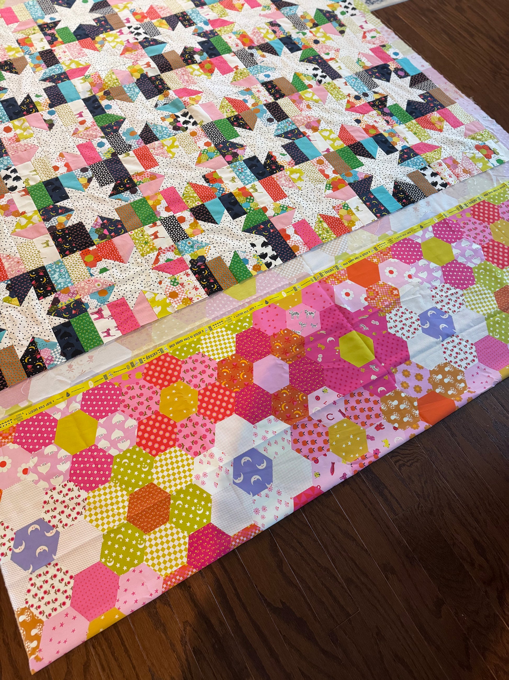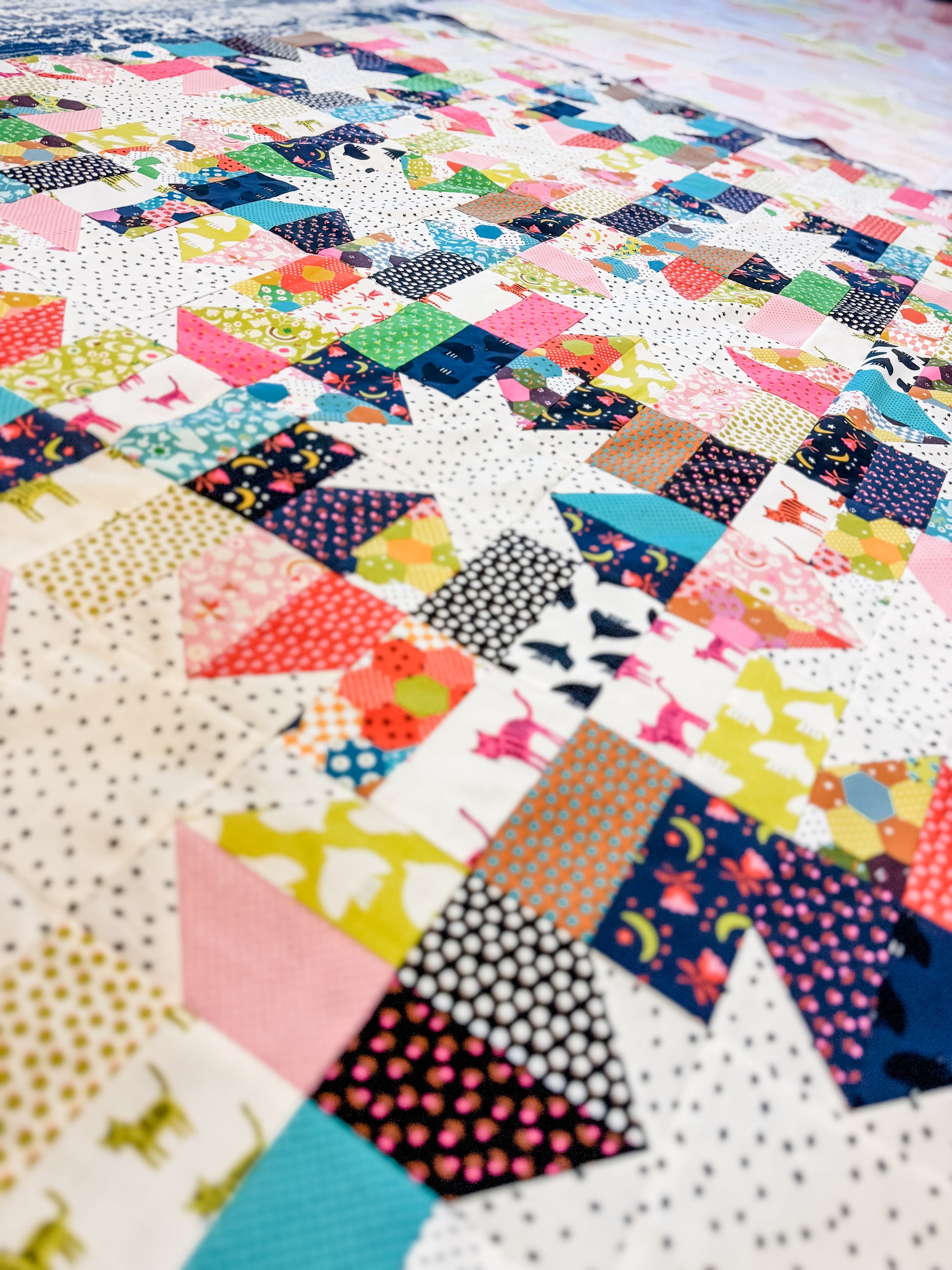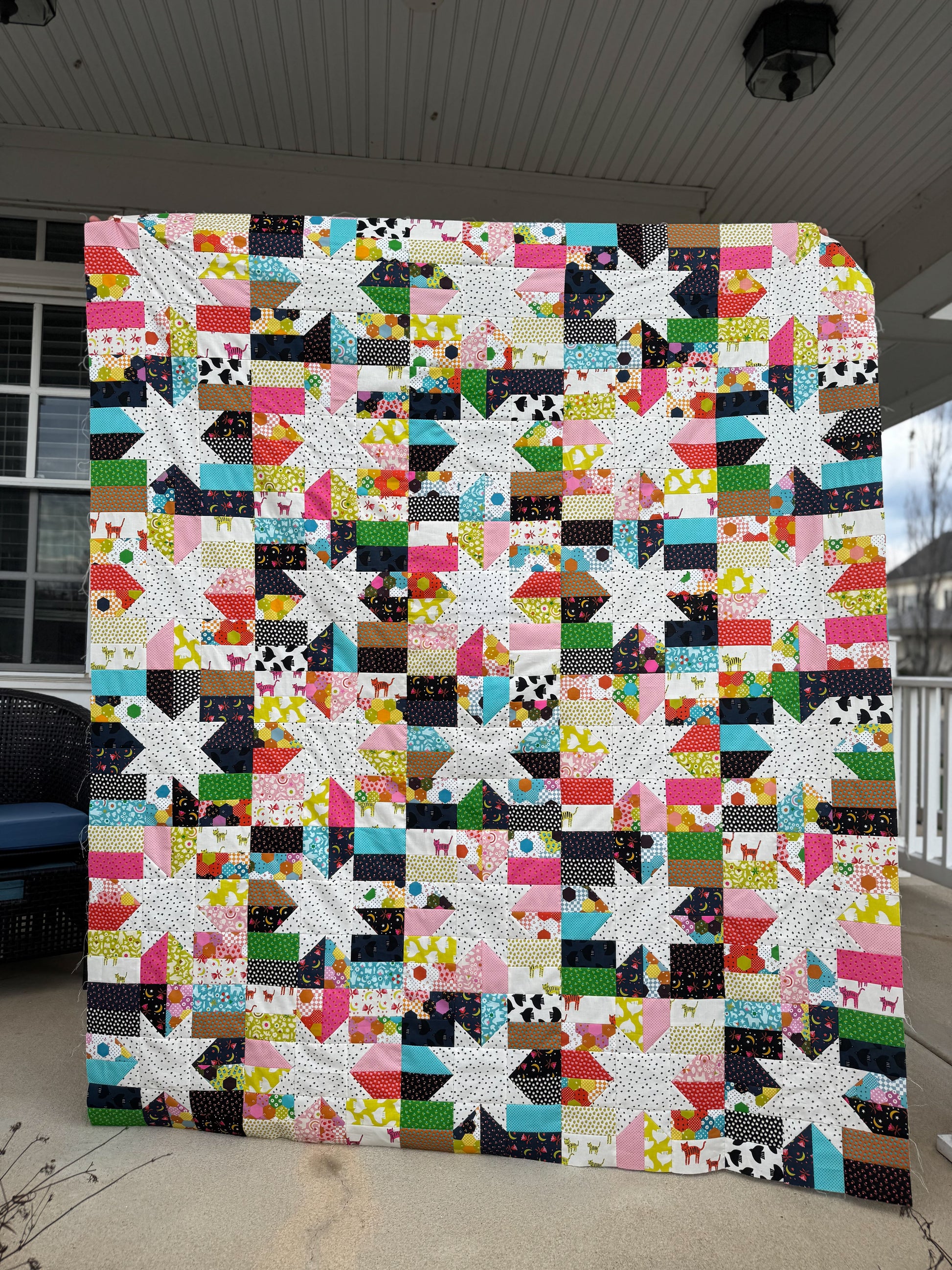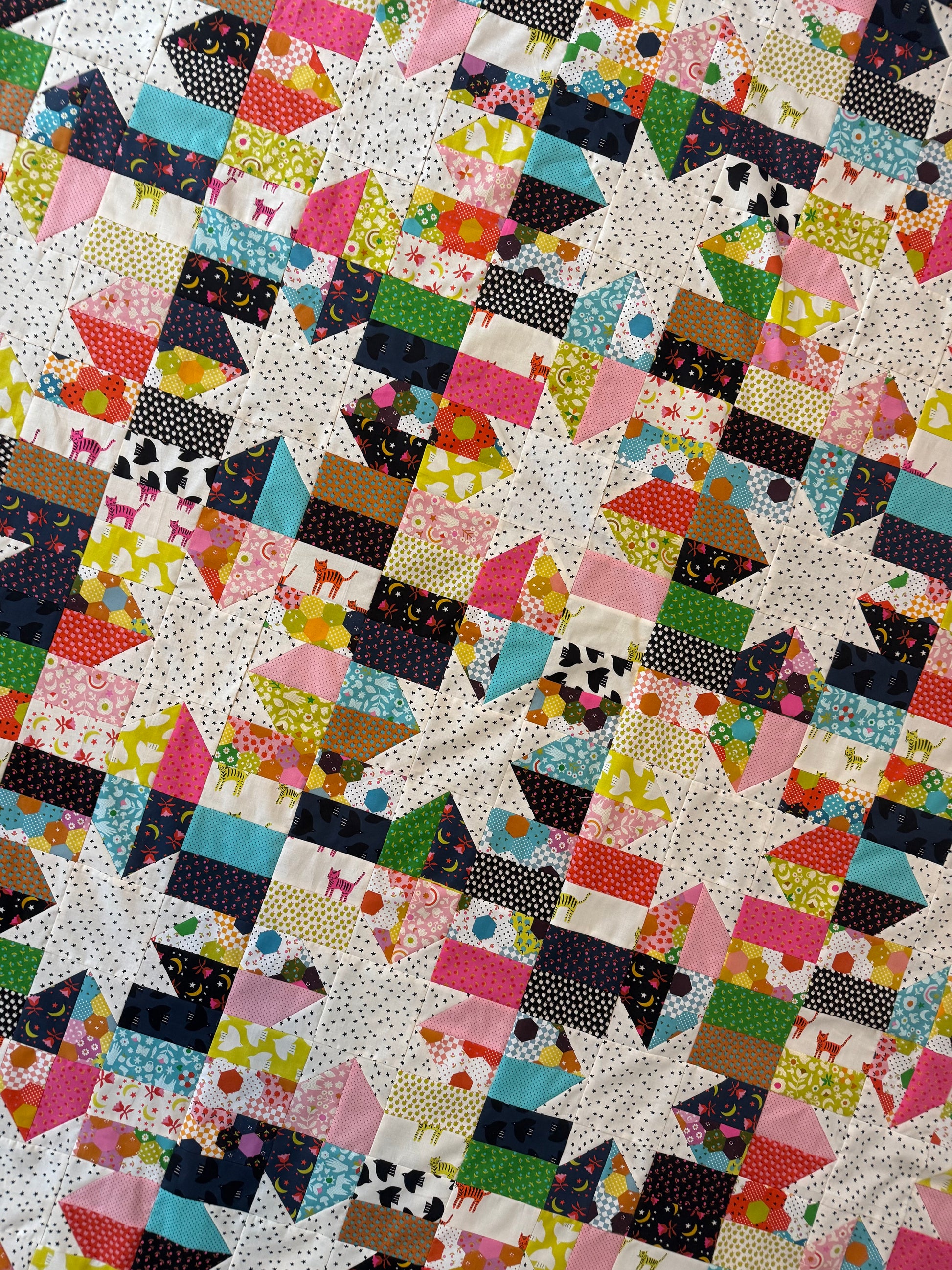 2 catnap jelly rolls, 1 3/4 yd starry mini natural, modernly Morgan pattern and a bonus of coordinating catnap binding. Makes a 60x72 throw